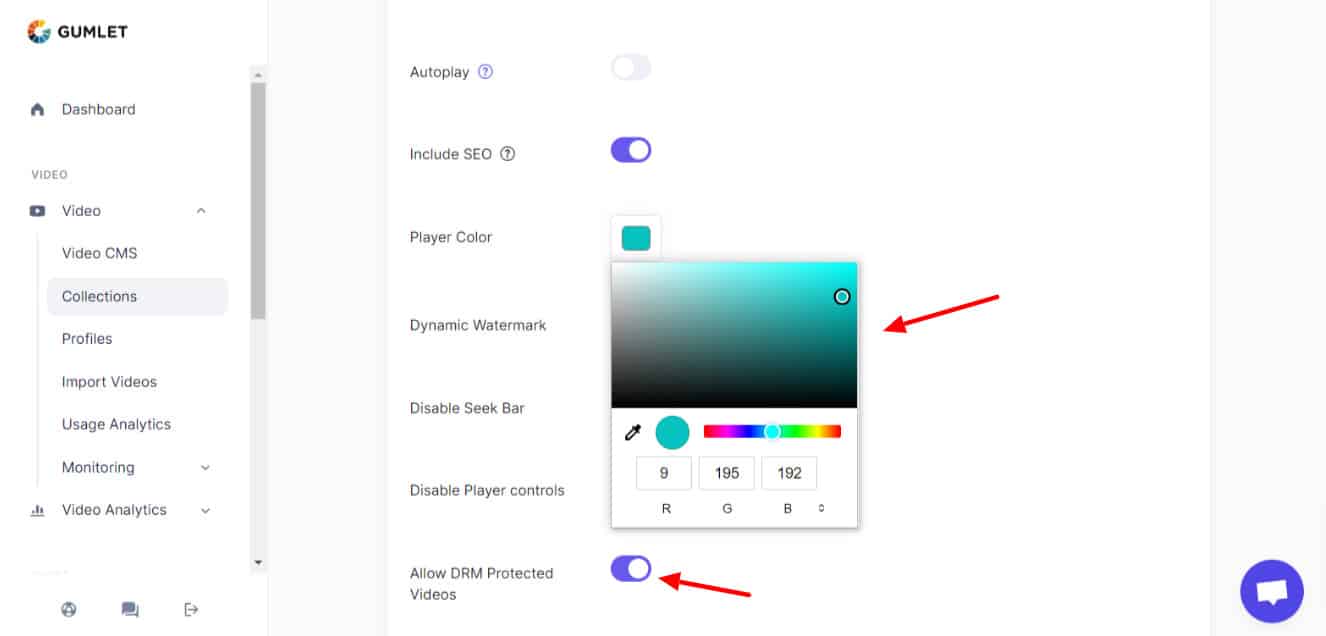 Under Player Settings, you can enable or disable pre-loading, auto-play, dynamic watermark, DRM encryption, Gumlet branding, etc. It also lets you select a color for your player.