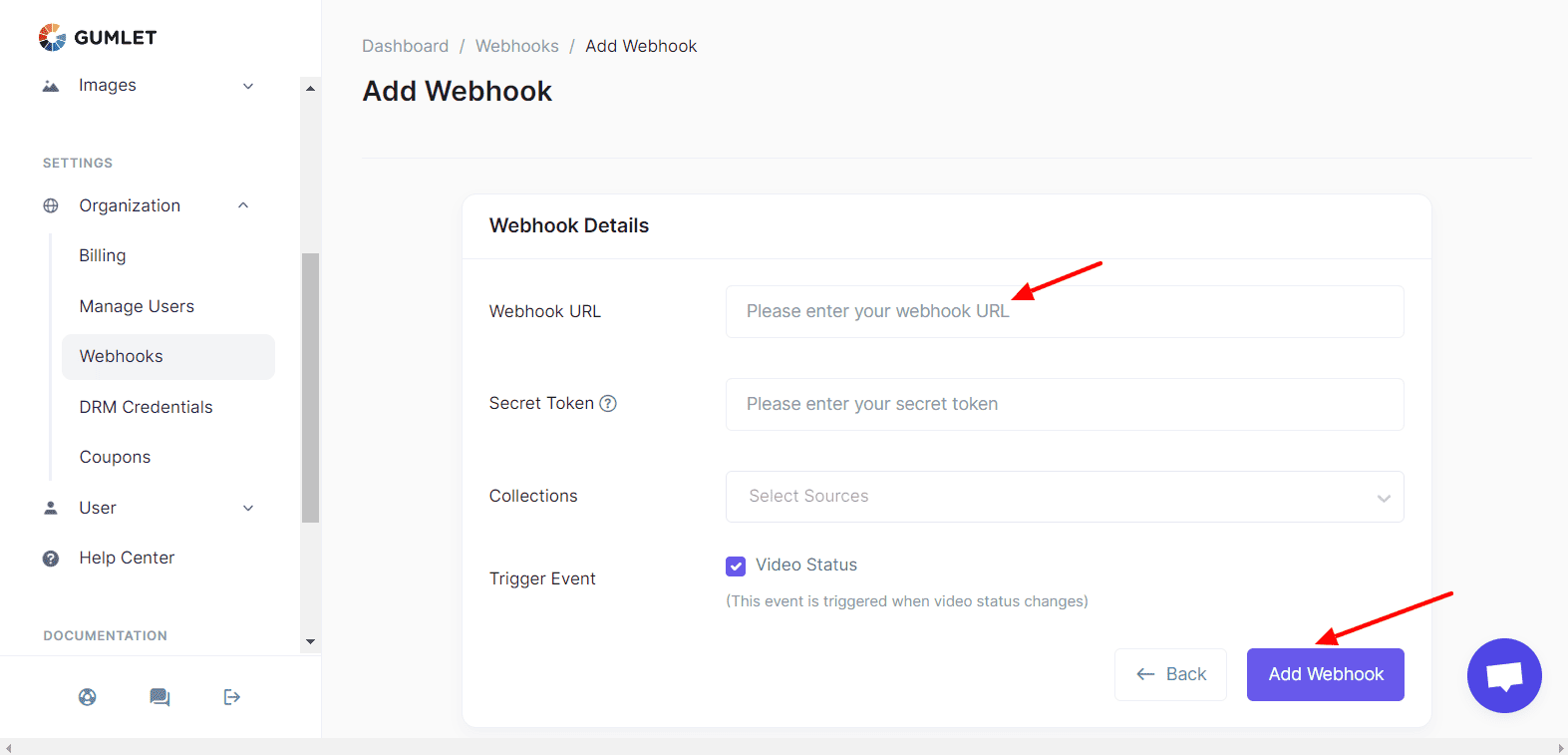 If you want to connect Gumlet with other platforms, it offers Webhooks to make that possible.