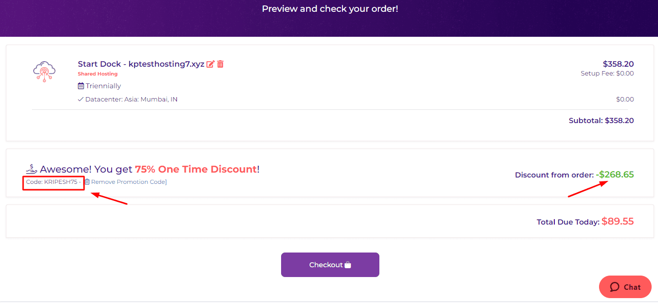 Finally, enter the coupon code KRIPESH75 in the Promo code field and click on ‘Checkout’ to complete your payment process. This is how you can avail a 75% discount on HostArmada hosting.