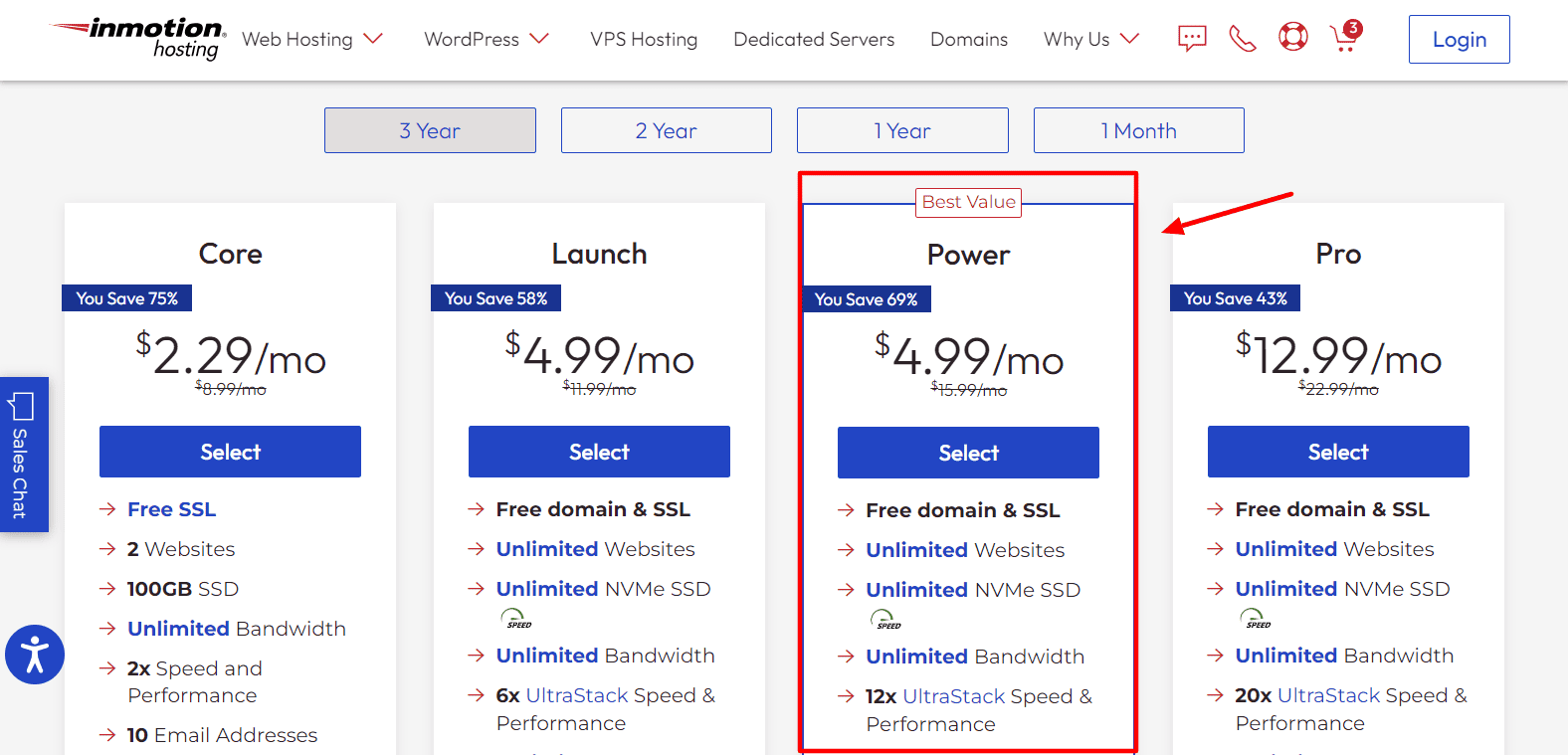 The pricing plans of InMotion hosting start from $2.29/month. In my recommendation, their Power plan for 3 years would be the best purchase. It is priced at $4.99/month and would cost you around $179 for 3 years. This plan would give you access to the BoldGrid website builder tool for free along with its hosting services.