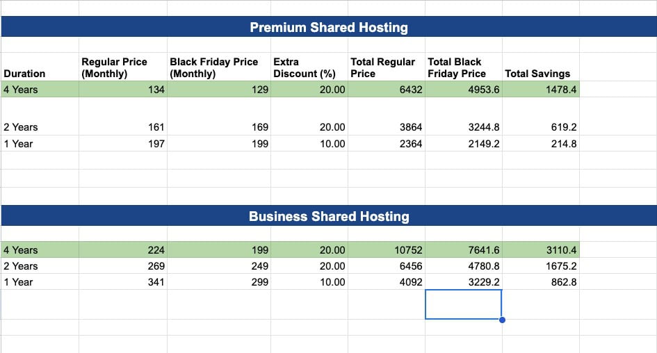 The above table features the regular pricing and the Black Friday pricing of different Hostinger plans. According to it, you’ll find the maximum discounts on the Premium and Business plans purchased for 4 years.