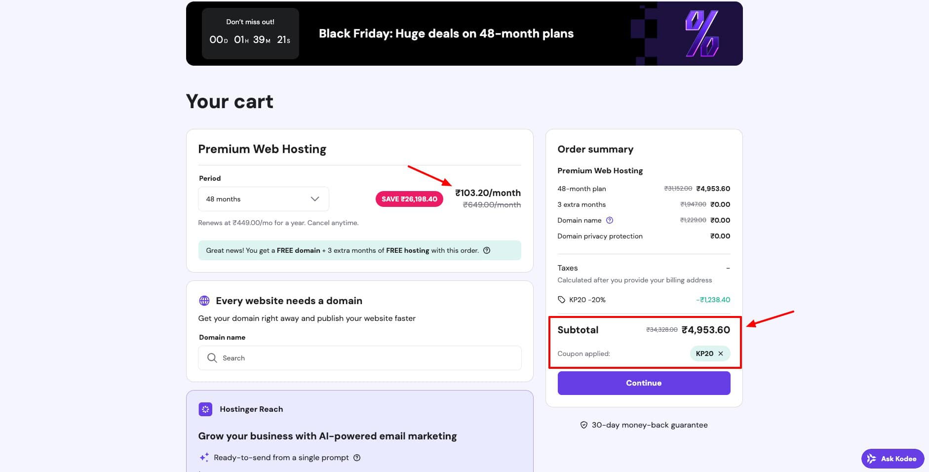 Finally, under the coupon codes section, you can enter the coupon code KP20. This would bring down the pricing of your 48-month plan to just ₹103.20/month and the overall pricing to under ₹5,000.