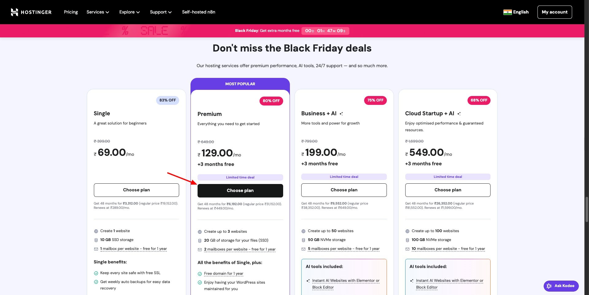 In my experience, its Premium and Business plans offer the best value during the Black Friday Sale. Both let you host up to 100 websites and include a free domain, free email, and AI website builder.