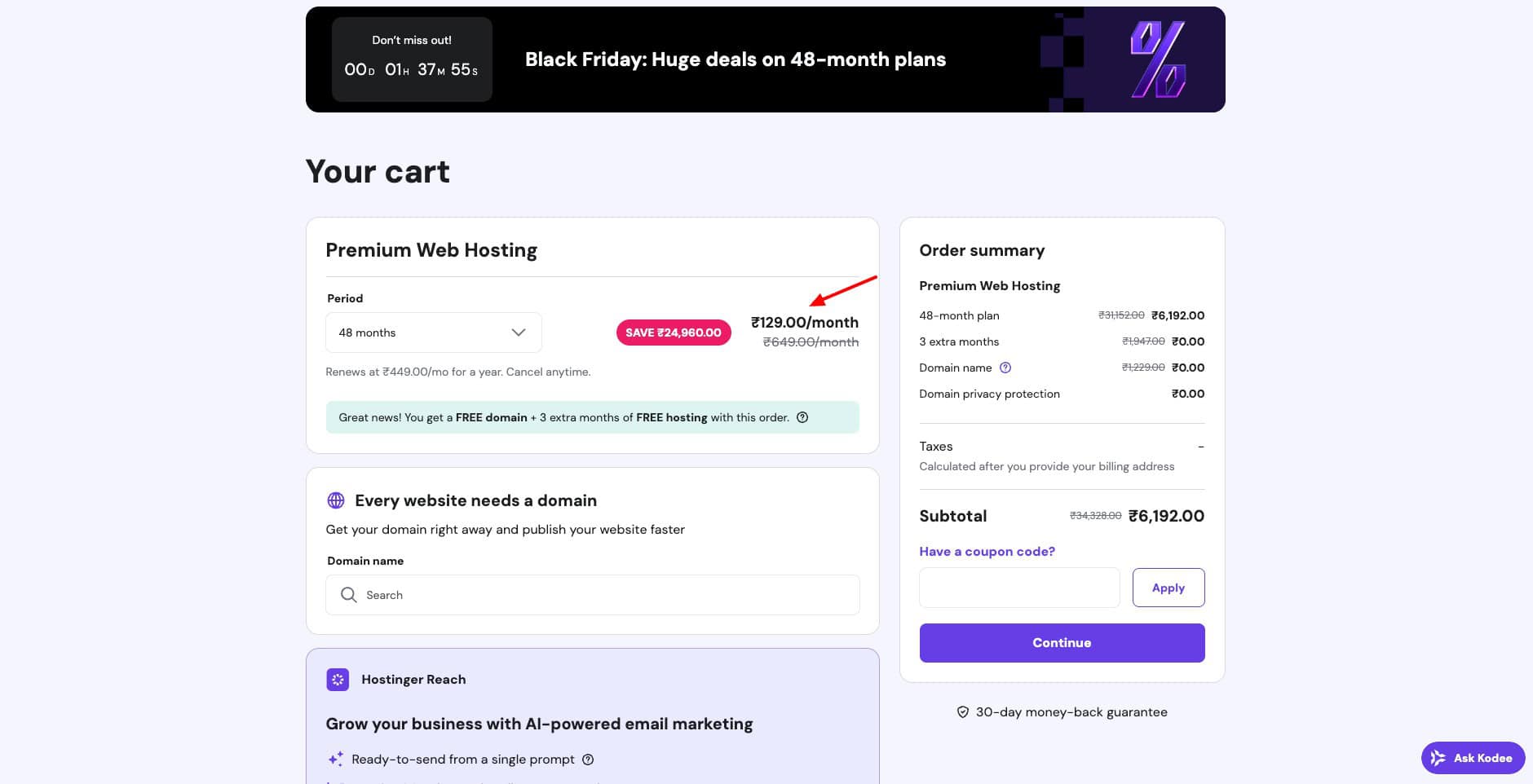 I have selected a period of 48 months for Premium Web Hosting, which costs me Rs.129/month.