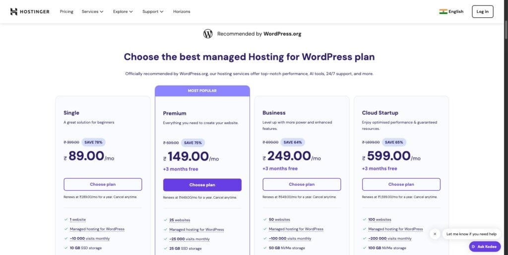 Along with a modern and easy-to-use interface, Hostinger offers excellent security features, swift speeds, efficient load handling, and lots of Indian payment options.