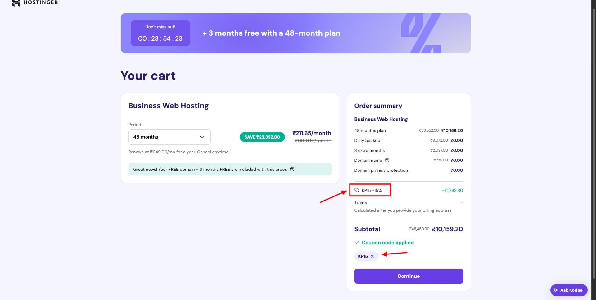 Next, enter my coupon code to get an additional discount. You can use the coupon code KRIPESH to get 10% off on your purchase. For a limited time, you can also use the code KP15 to get 15% off on your plan!