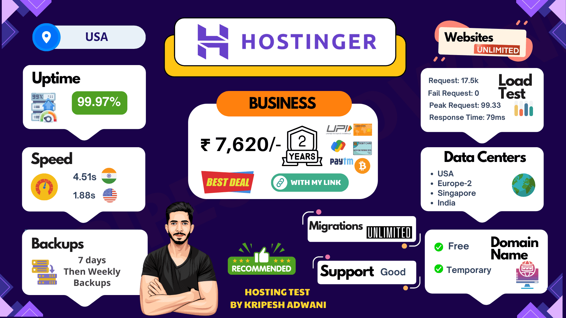 Hostinger offers fast speeds, solid security, a user-friendly builder, and seamless Indian payments, making it a great value for money. However, its CDN performance is average, and support response times could improve.