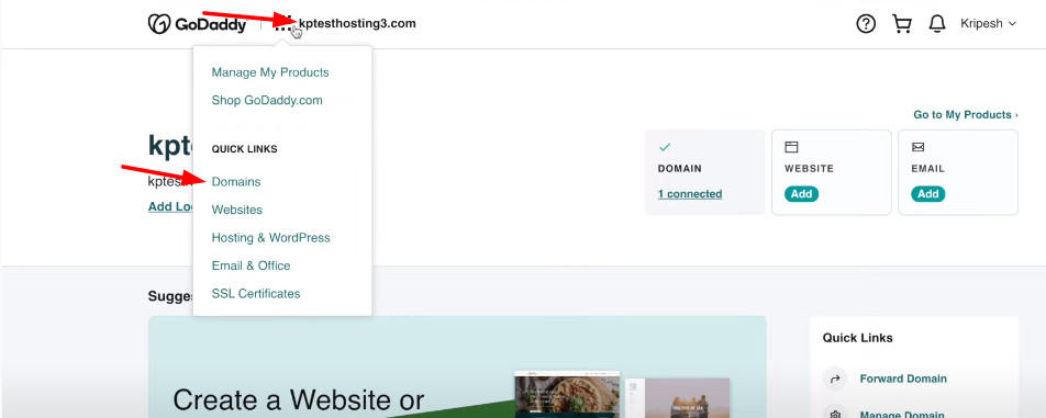 Now, to manage the domain you have purchased, click on your domain name on top of the page. In the drop-down menu, click on the Domains option.