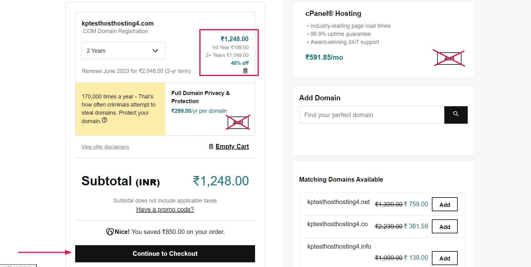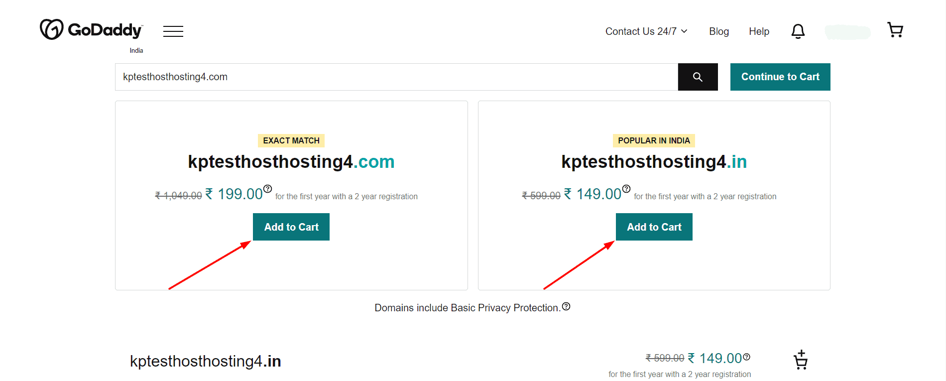 It shows the available domain names with different TLDs (top-level domain). Here, for kptesthosting3.com, we got two available names – kptesthosting3.com and kptesthosting3.in at different prices. Select a suitable plan by clicking Add to Cart.