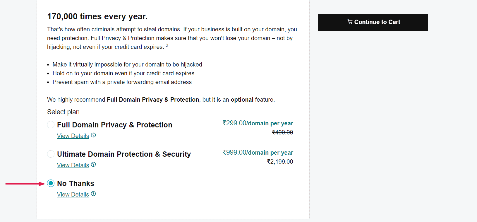 After you select your domain name, you get options to select the security plans. Select the No thanks option which also includes the WHOIS protection