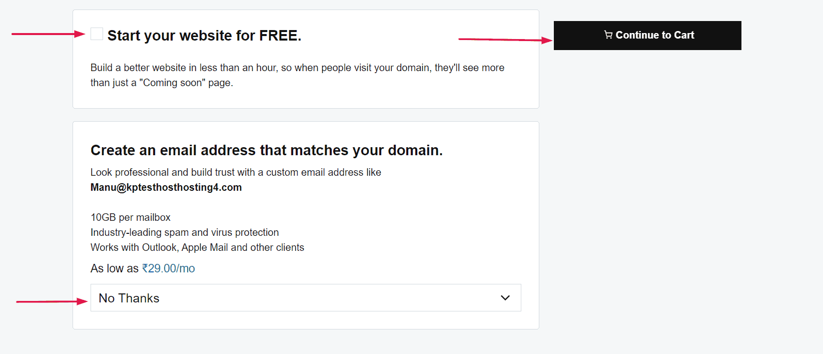 In this step, you get an option to buy an email that matches your domain name. Select ‘No Thanks‘ if not required (Not recommended to buy here if you will purchase hosting from another provider).