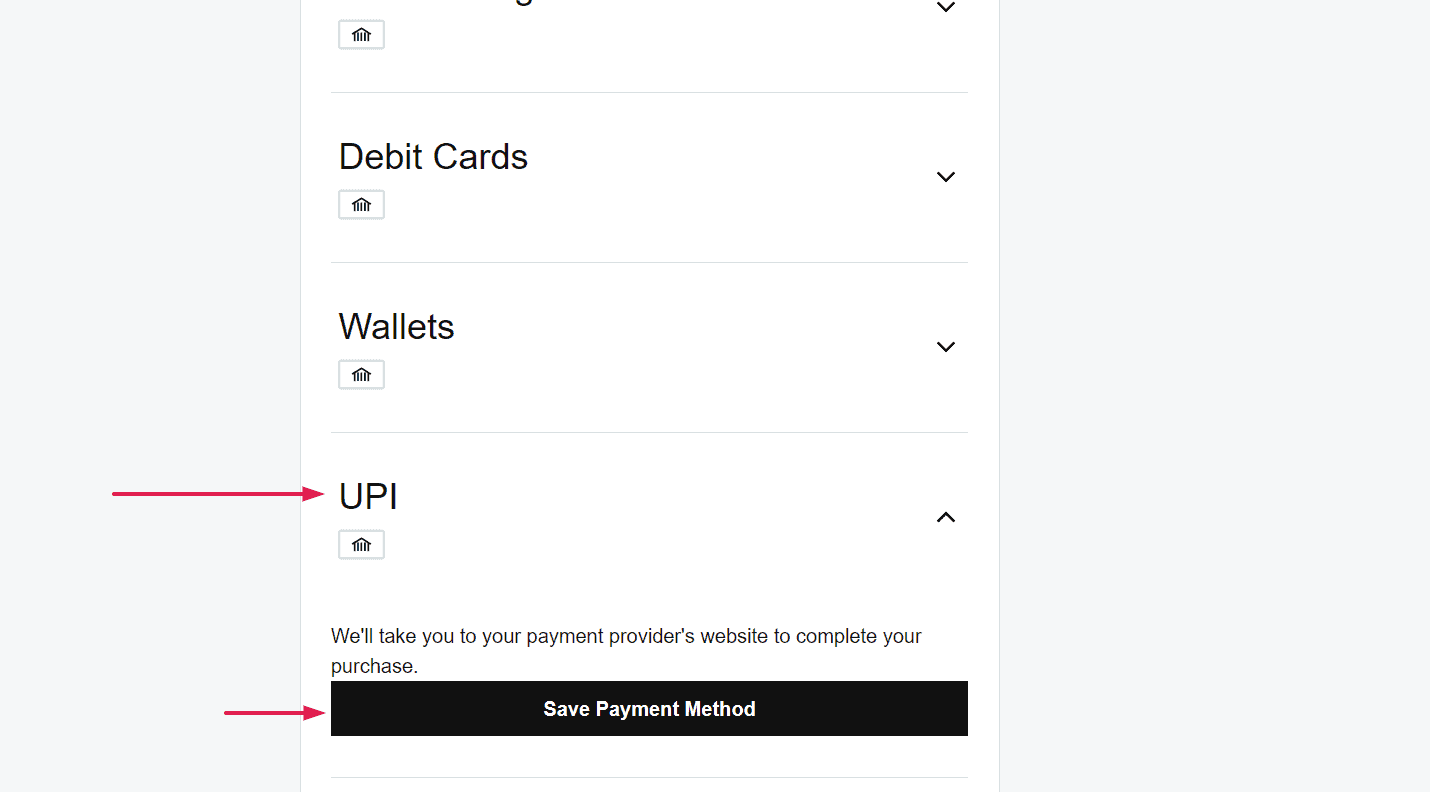 Now, select the method through which you want to make the payment. Here, I will select the UPI method. Then, click on the Save Payment Method.