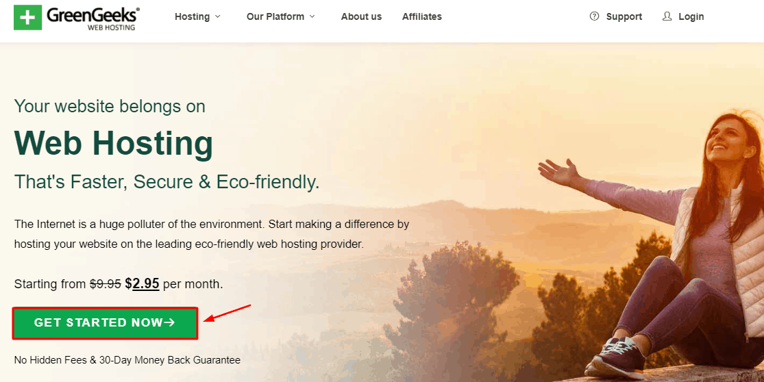 First, we will visit the website of GreenGeeks and hit the ‘Get Started’ button.