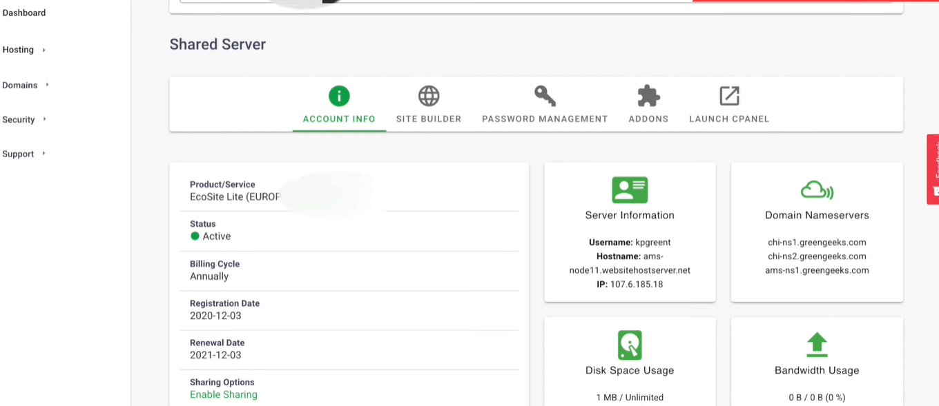 I found the interface of GreenGeeks to be quite clean. We can view and manage our hosting accounts, change nameservers, and launch cPanel as well!
