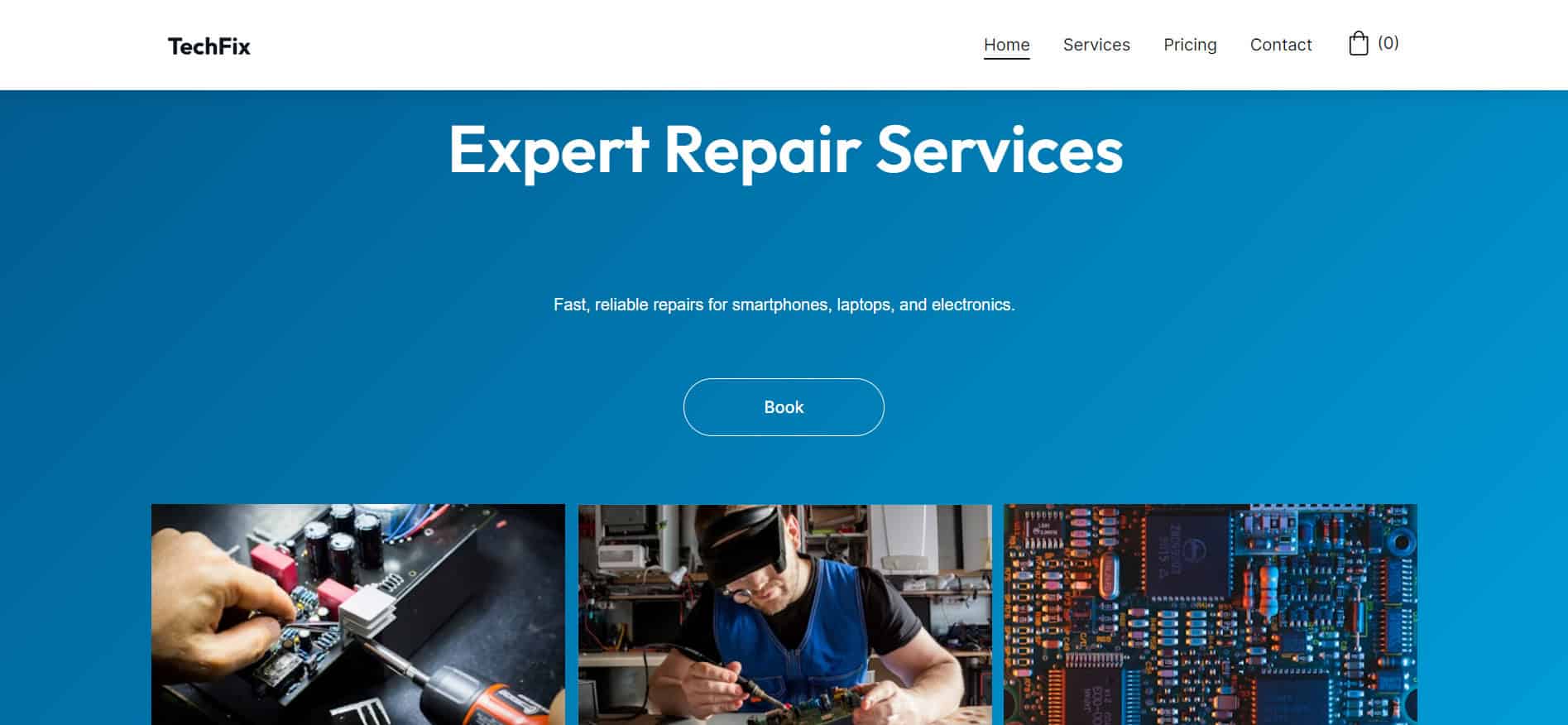 Prompt: TechFix provides expert repair services for smartphones, laptops, and other electronics. This website prioritizes a trustworthy and professional feel. A blue-and-white color scheme conveys reliability.