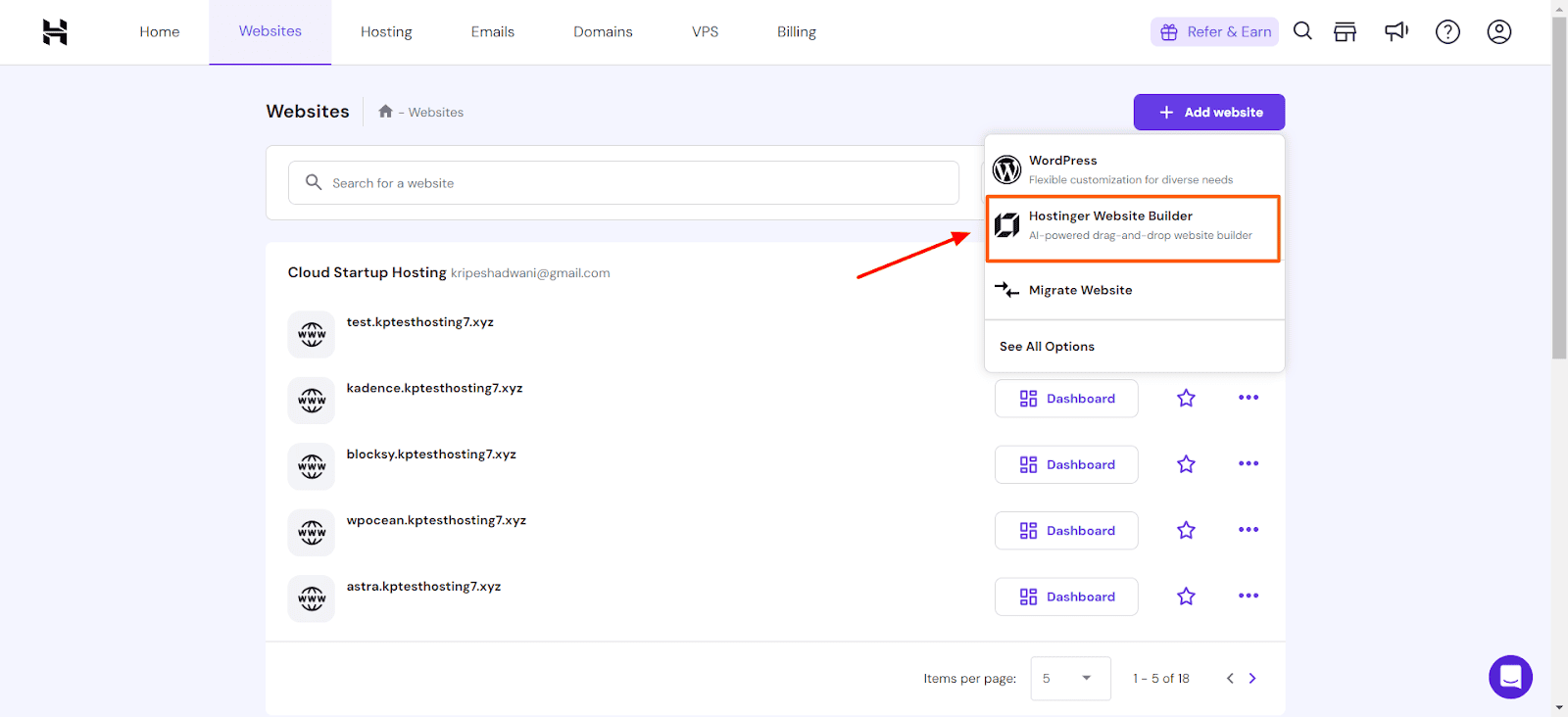 Head over to the Websites tab and click on the āAdd Websiteā button. Choose the Hostinger Website Builder to create your website.