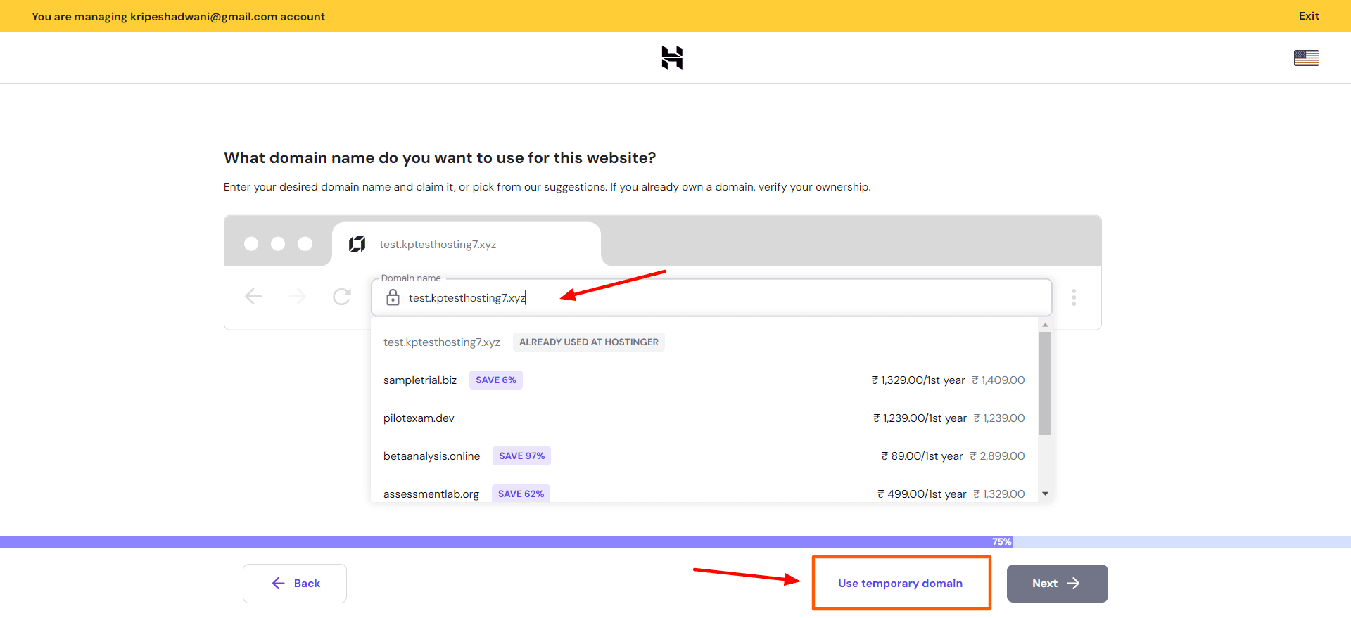 Next, you will need to specify a domain name for your website. If you already have a custom domain name, you can enter that. Otherwise, click on the āUse temporary domainā button in the bottom right corner. Finally, hit the āStart Creatingā button.