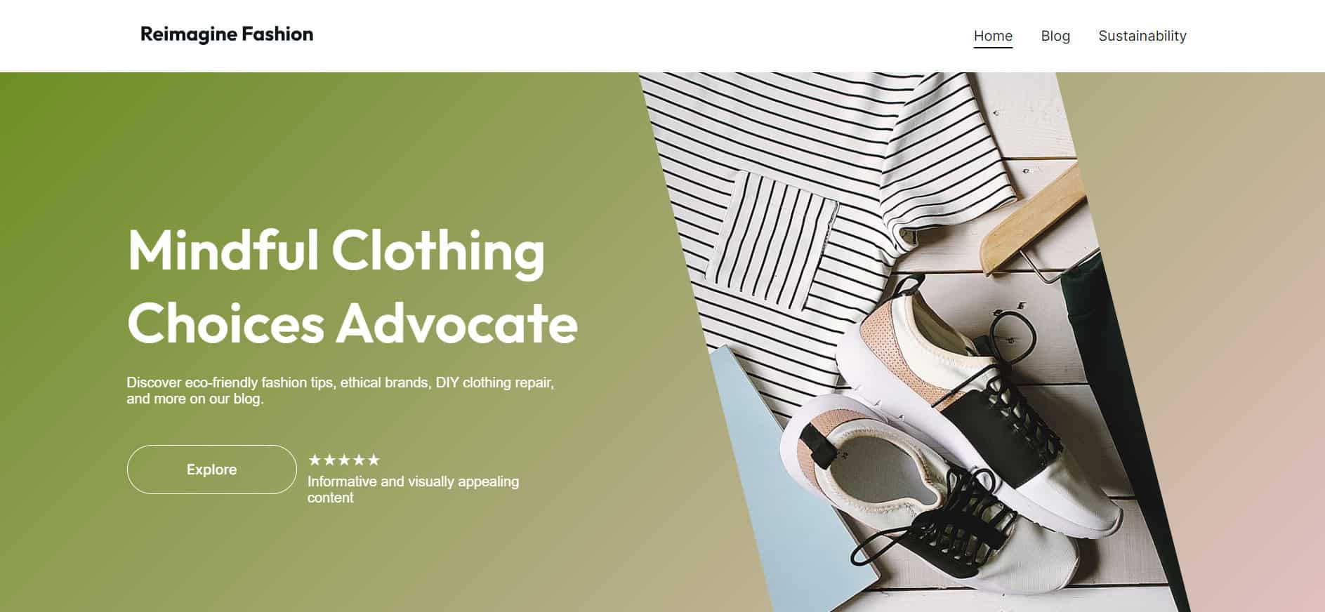 Here, Iām trying to design a sustainable fashion blog called Reimagine Fashion. I have used the following prompt for it: