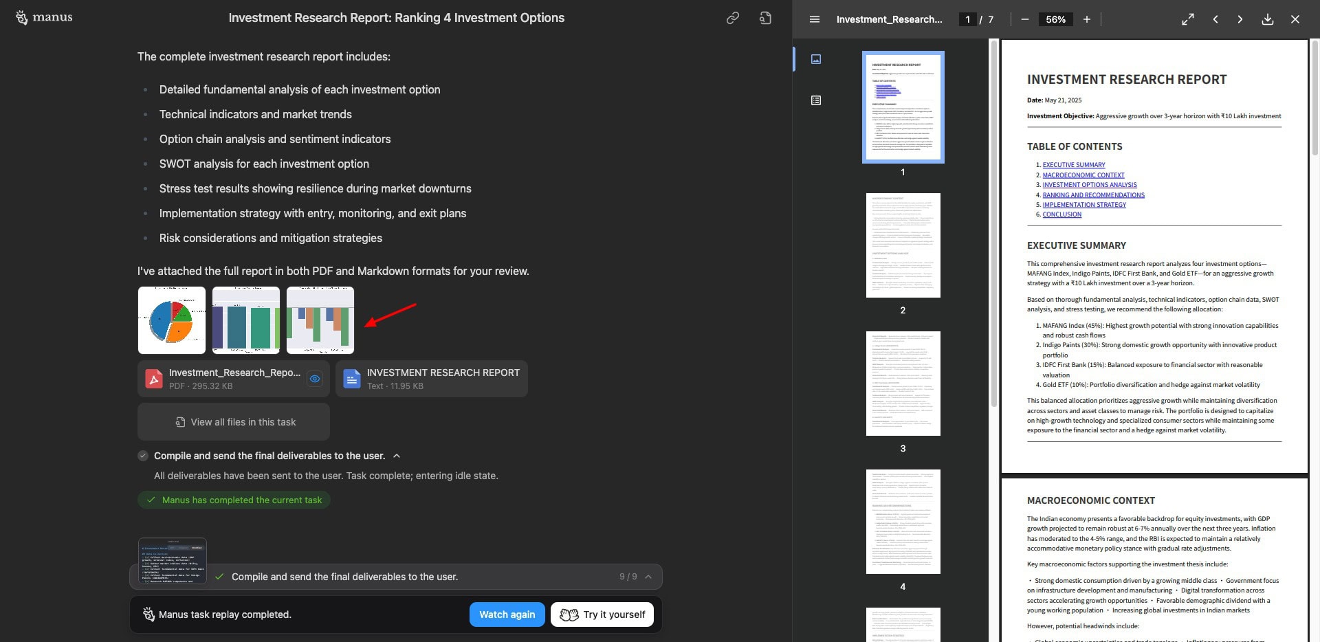 A detailed report with supporting charts, graphs, and data visualizations (e.g., historical price charts, option chain visuals, VIX graphs).Individuals who are into finance can check out this use case for better financial research. I would personally choose Manus AI to research investments, stocks, and mutual funds.