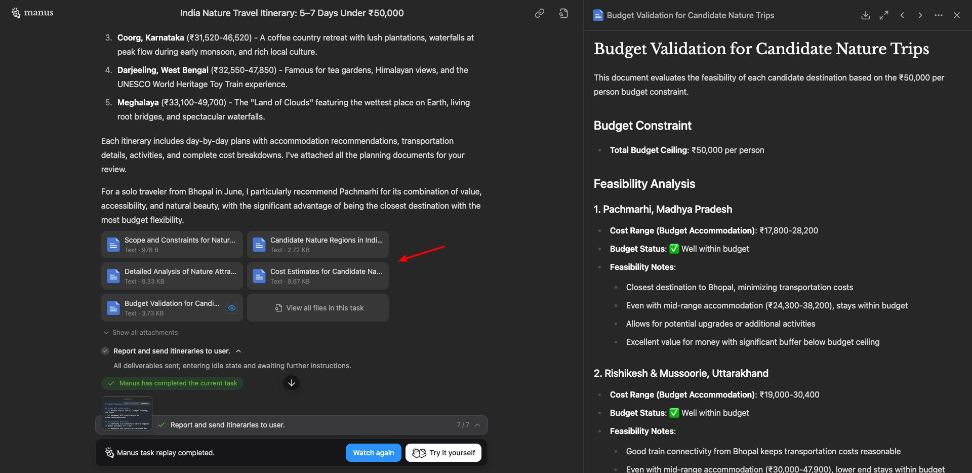 Planning trips and vacations is another big use case of Manus AI. You simply need to provide it with a detailed prompt outlining the travel duration, budget, number of members, theme of travel, and any other important details for creating an itinerary.
