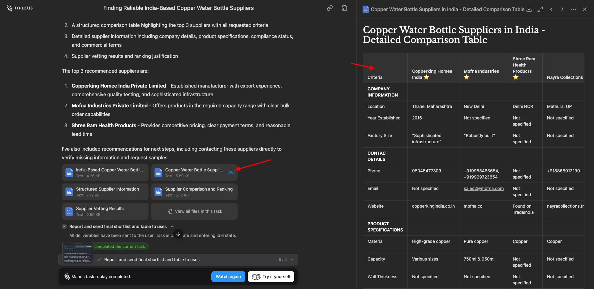 If your work revolves around e-commerce, this use case would interest you. Manus AI can help you source e-commerce suppliers for any kind of product with accuracy.