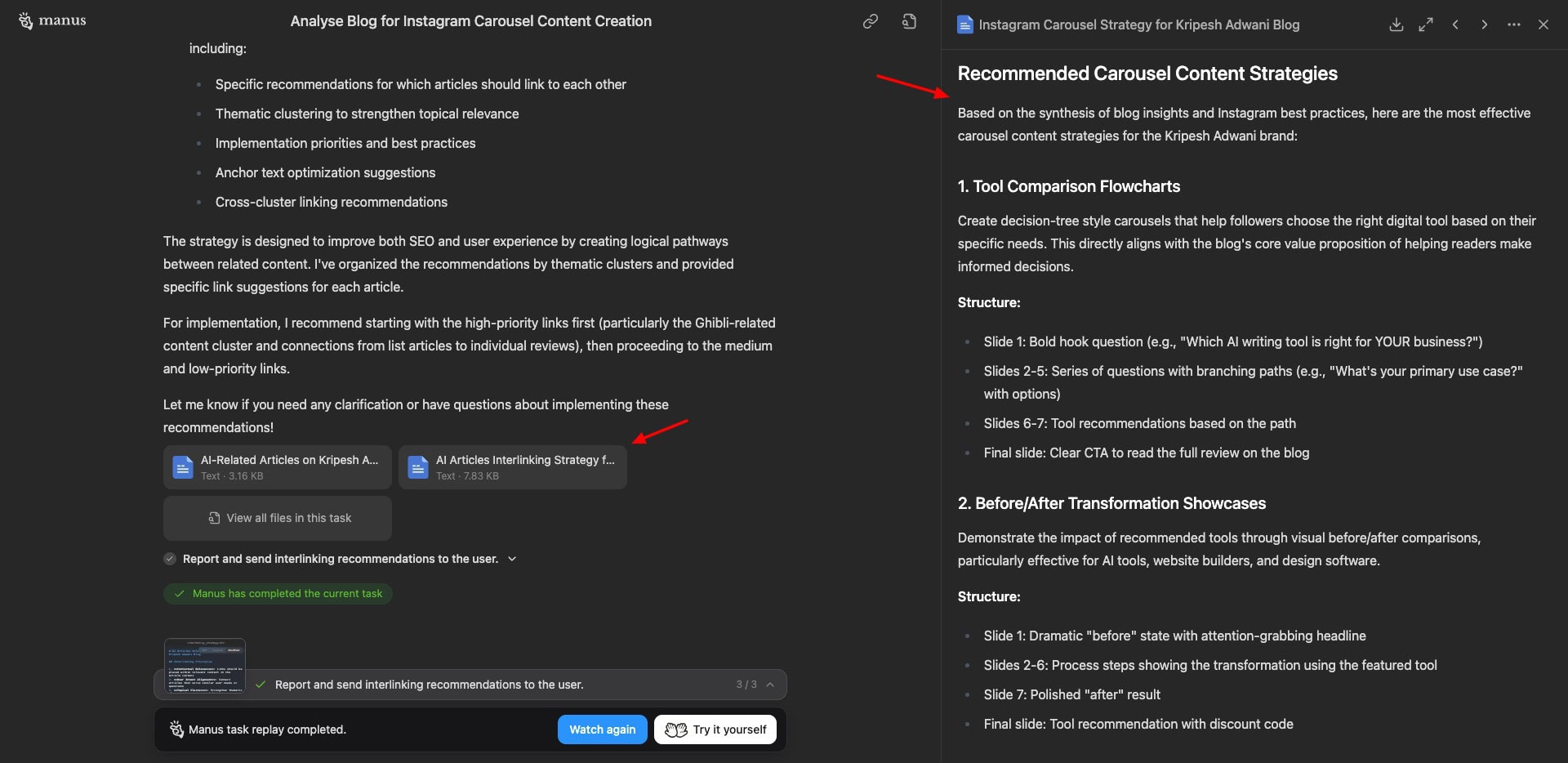 Manus AI can also create social media content for you from your blog. For instance, I provided my blog URL and requested it to help me create Instagram carousel posts from it.