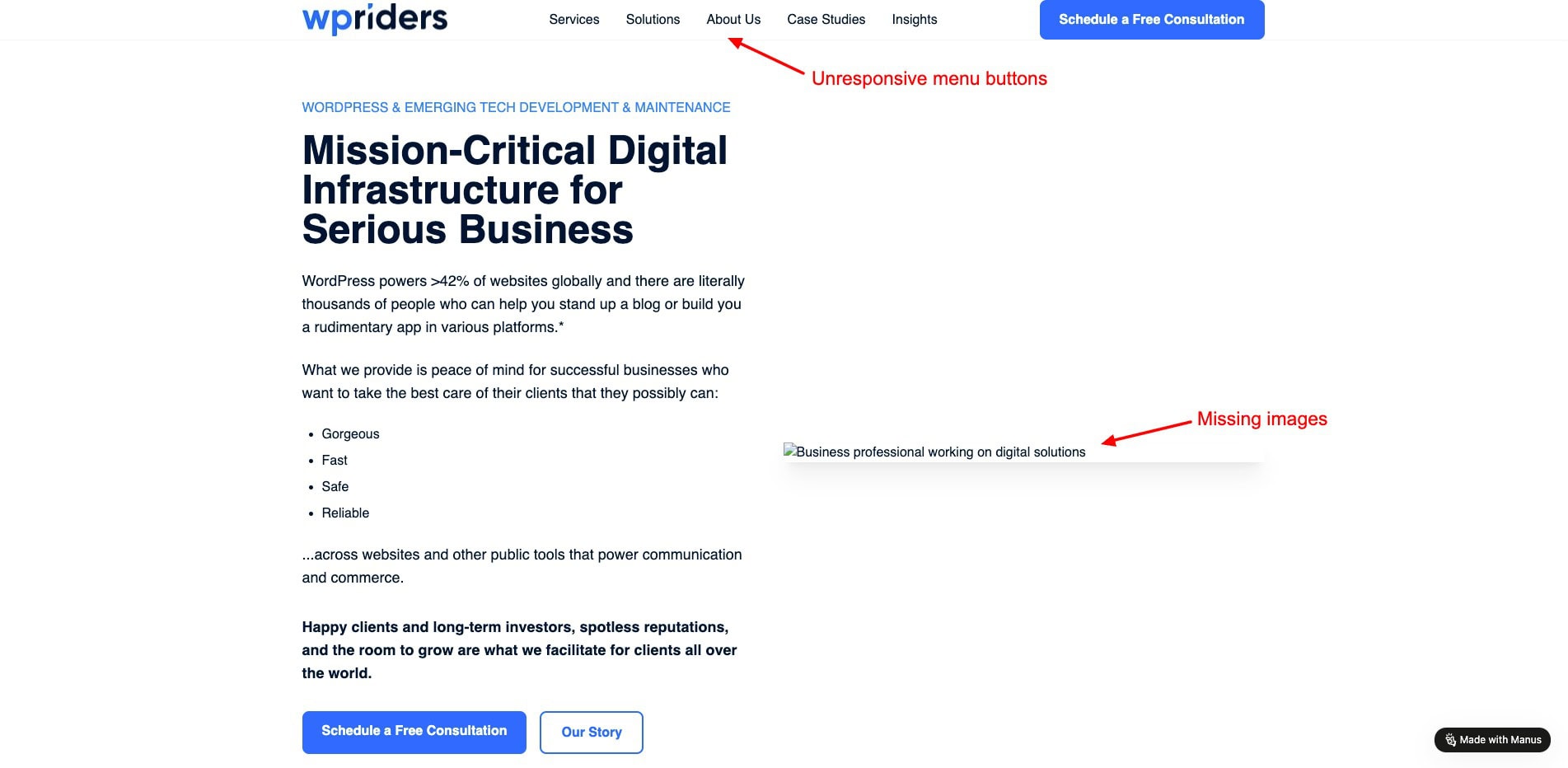 For instance, I tried to create a clone of the website https://wpriders.com/. It took a significant amount of time to process it. And yet, the URL it generated didn’t work. On requesting another URL, the results were okayish. It lacked the finesse of a fully functional website.