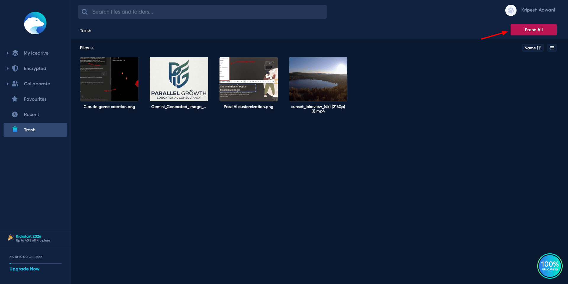 The Trash tab holds all your deleted files and folders. Unlike many other cloud storage services, Icedrive offers unlimited trash. So, all your deleted items remain there unless you manually delete them using the ‘Erase All’ option.