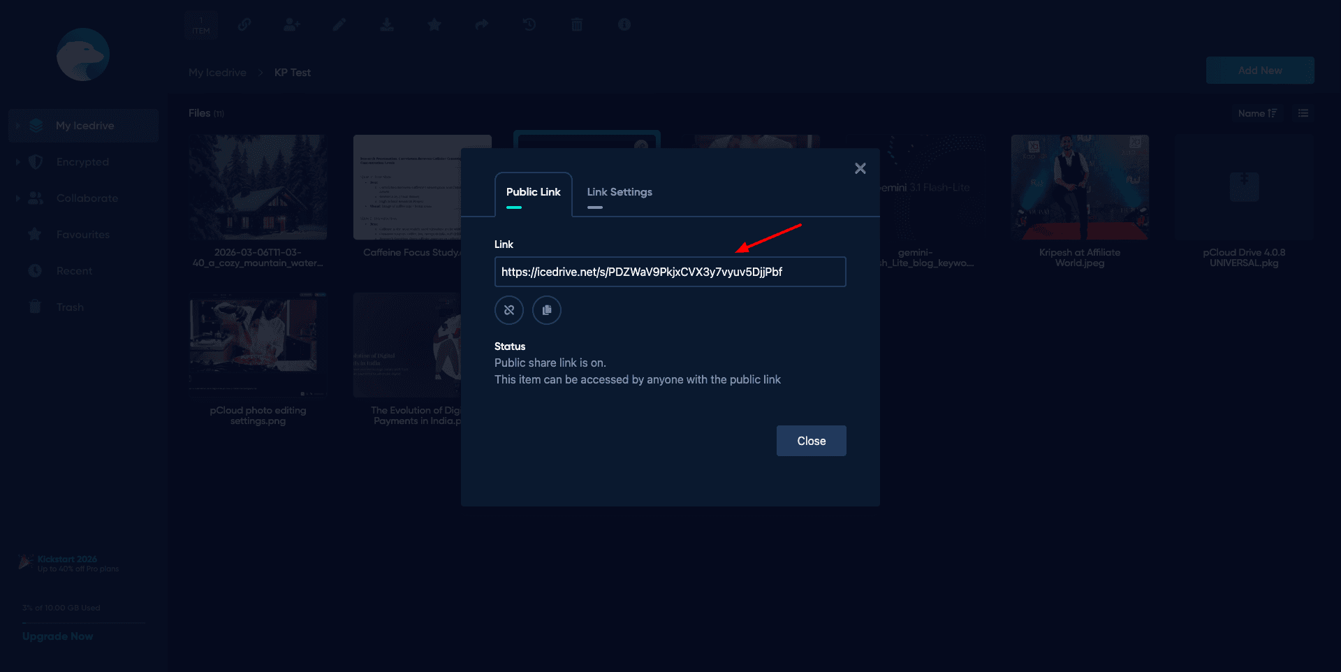 However, the option to add collaborators, request files, and public link controls is only available on the paid plans of Icedrive. For free, you can simply share public links and add comments.