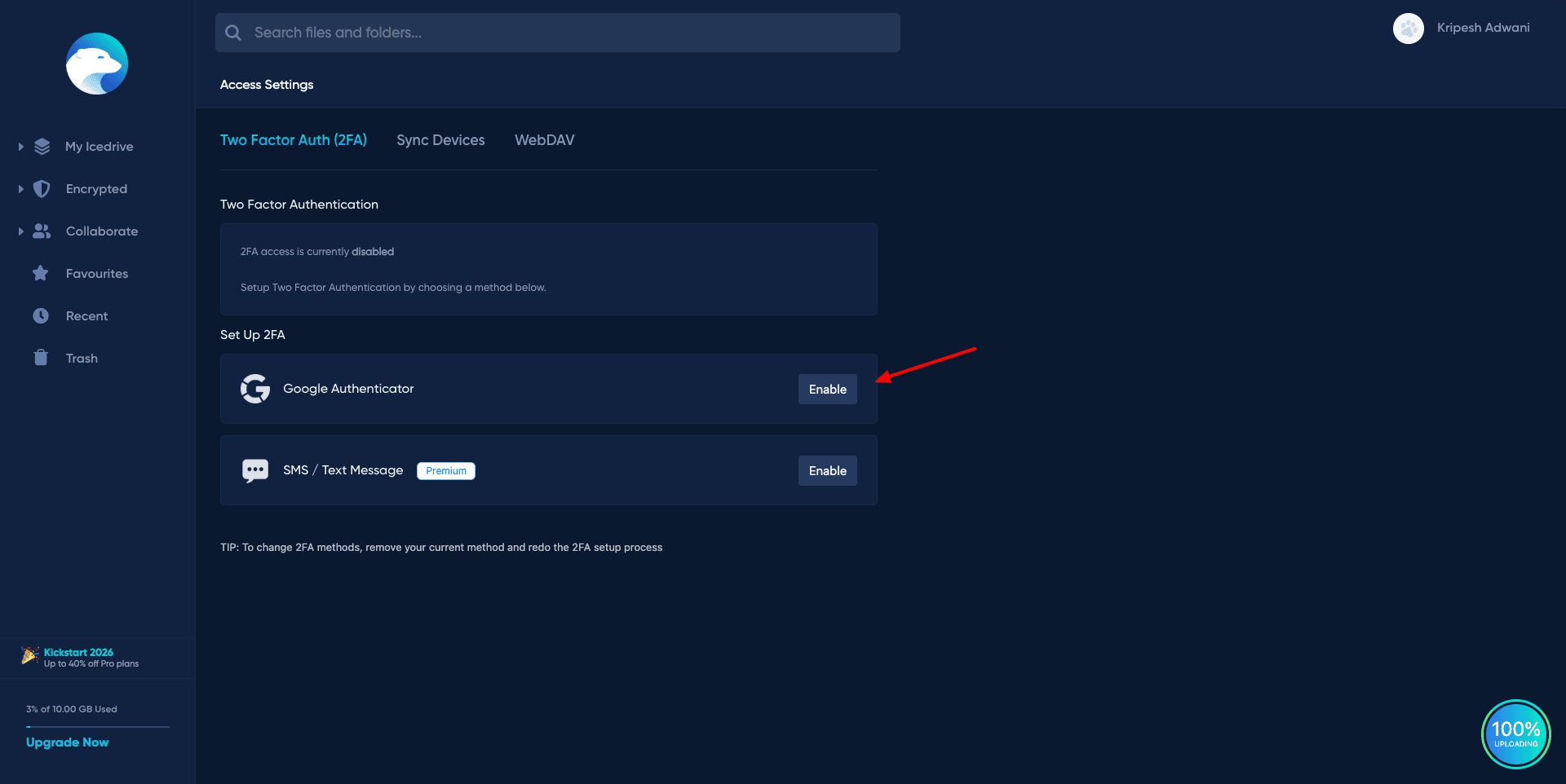 - 2FA – It requires a second factor besides your login credentials to authenticate you. You can enable 2FA on Icedrive through Google Authenticator, and Text Message/SMS.