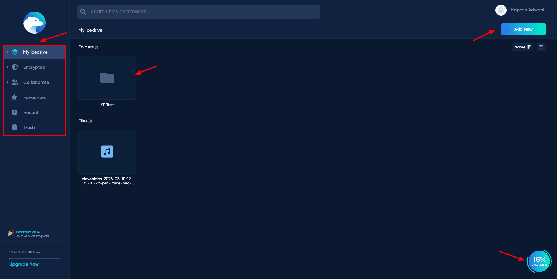 When you upload a file, it shows a cool animation with the upload percentage in the bottom right corner. On the left panel, you get all the key features, including encrypted vault, collaboration activity, favorite files, recent files, trash folder, etc.