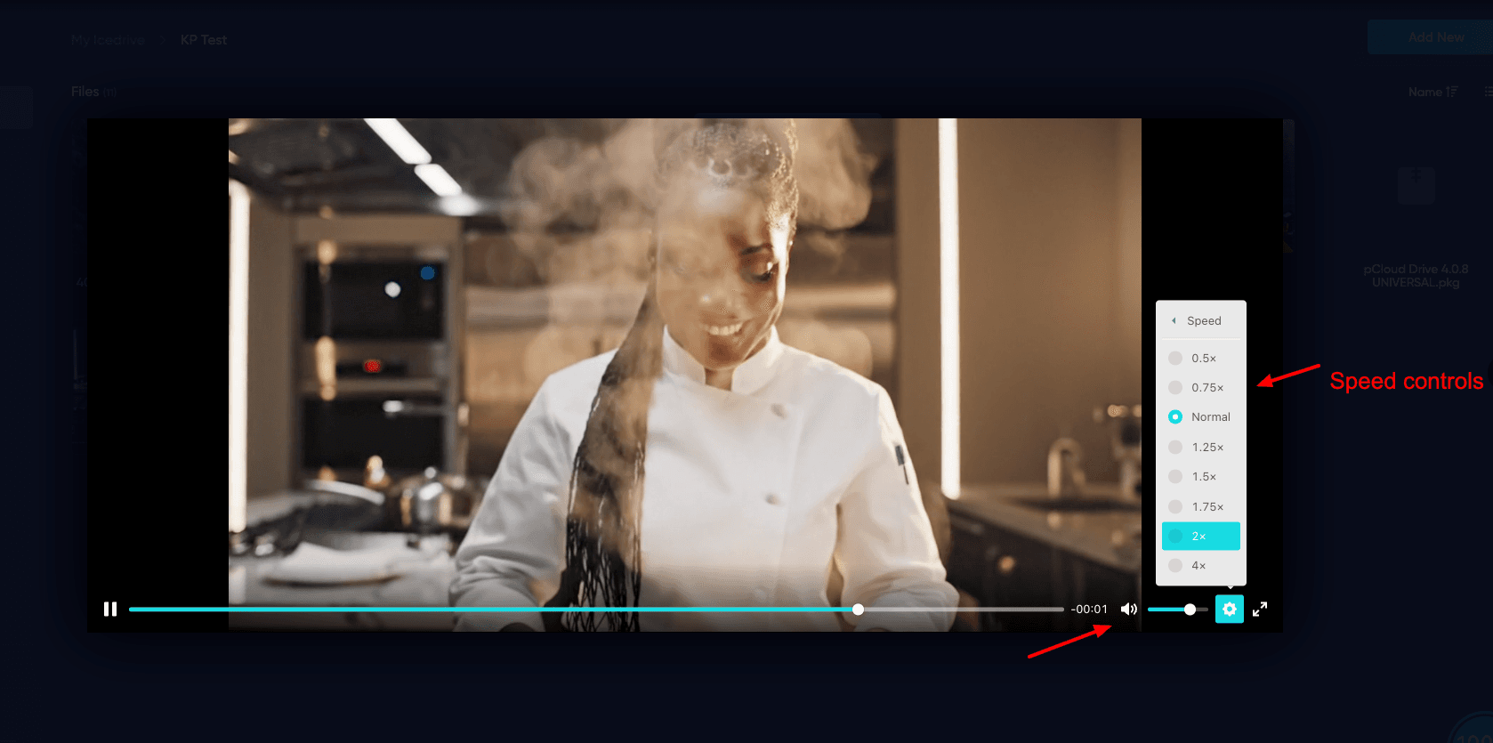 Icedrive has integrated players for audio and video playback on the web version and mobile apps. You can vary the speed of your audio playback from 0.5x to 4x and adjust the volume. The desktop app uses your internal media players.