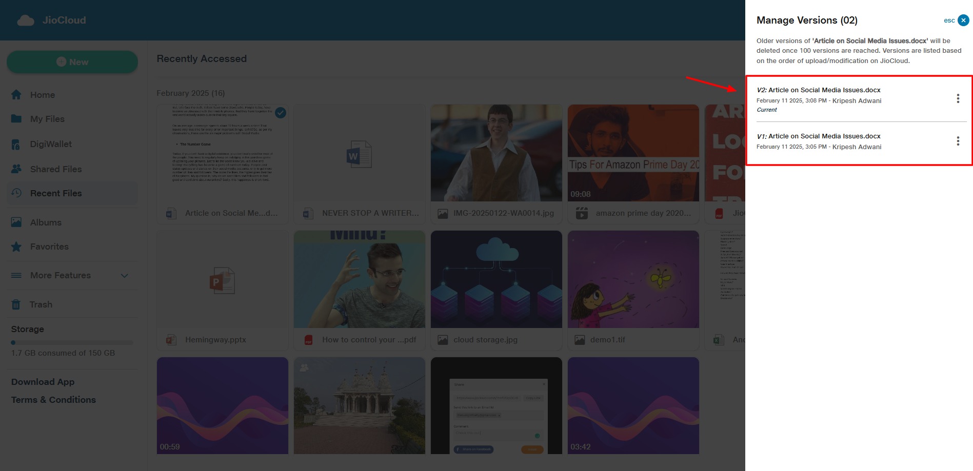 JioCloud File History and Recovery