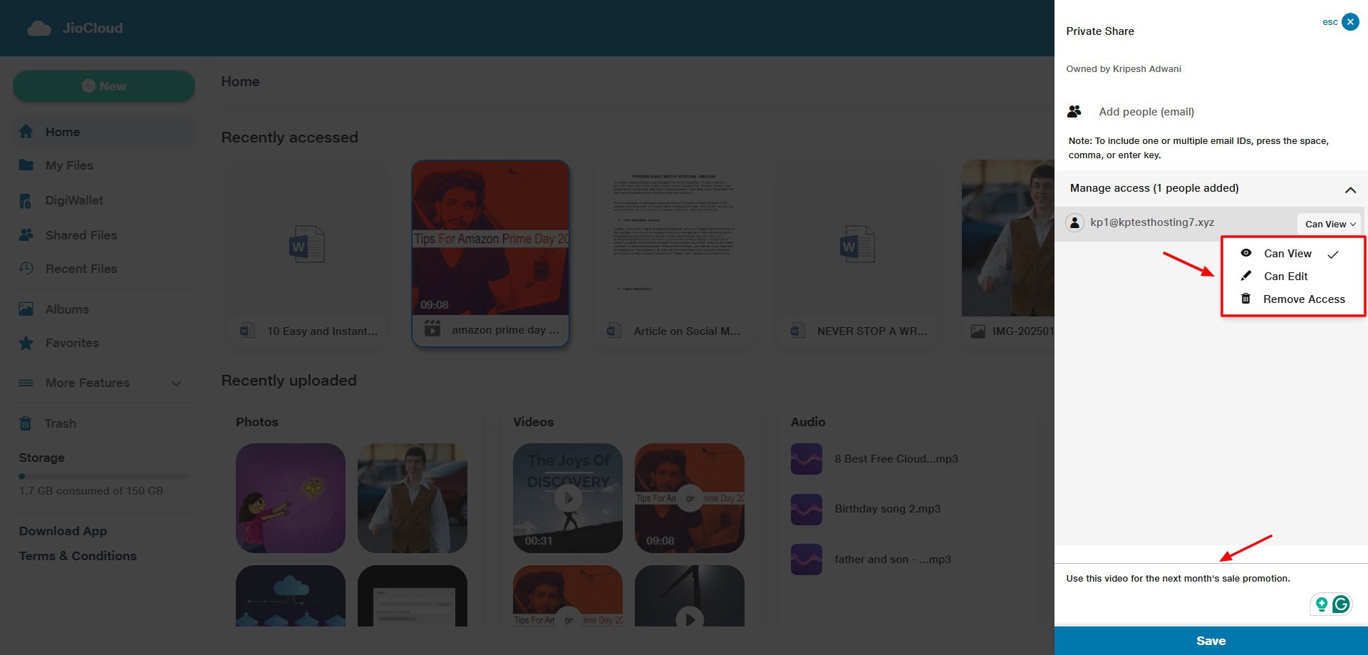 To privately share your cloud files on JioCloud, you simply need to enter the recipient’s email ID and specify if they can view or edit the shared data.