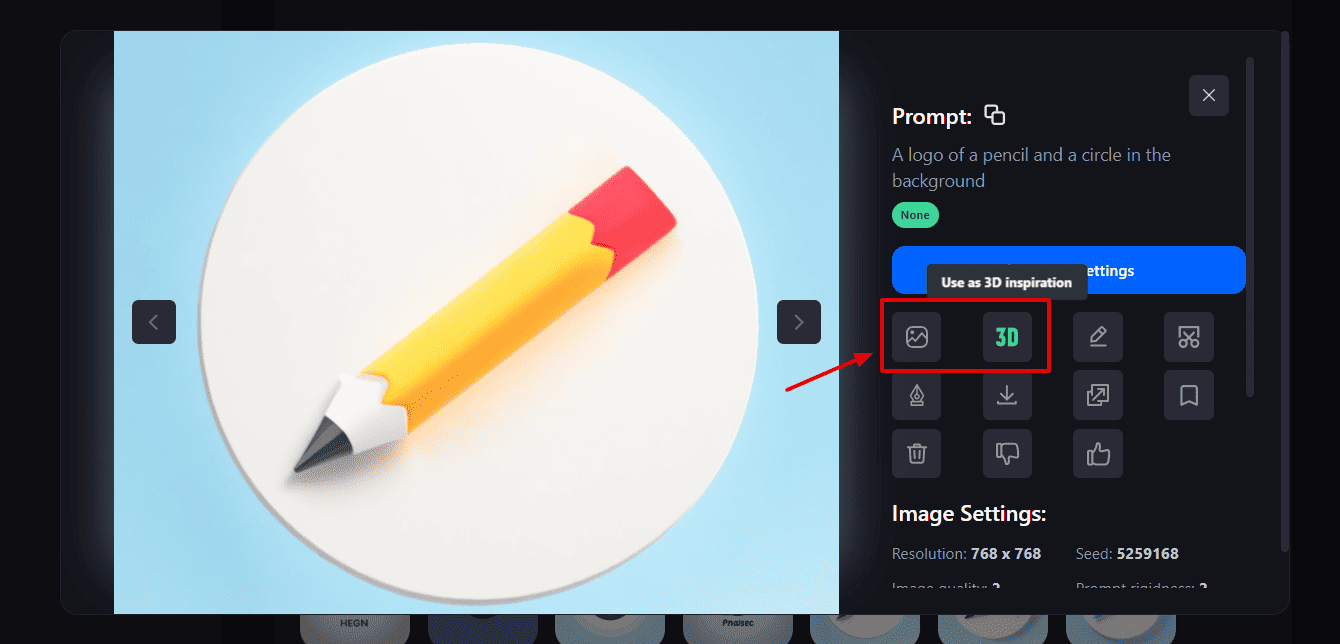 Similarly, if you wish to convert your 2D logo into a 3D one, all you need to do is push the “Use as 3D inspiration” button. Then, simply tweak the settings according to your preferences, select the 3D image format, frame your prompt, and you’re done!