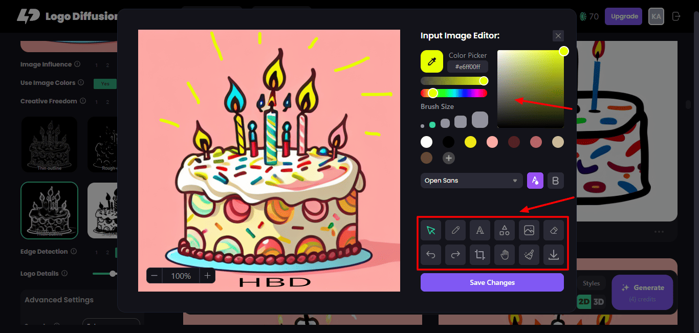 Besides generating the custom logo of your dreams, Logo Diffusion also features image editing functionalities. You get advanced editing features to customize the colors, add text, edit logo font, add basic shapes and images, and draw anything using the pen tool over your image.
