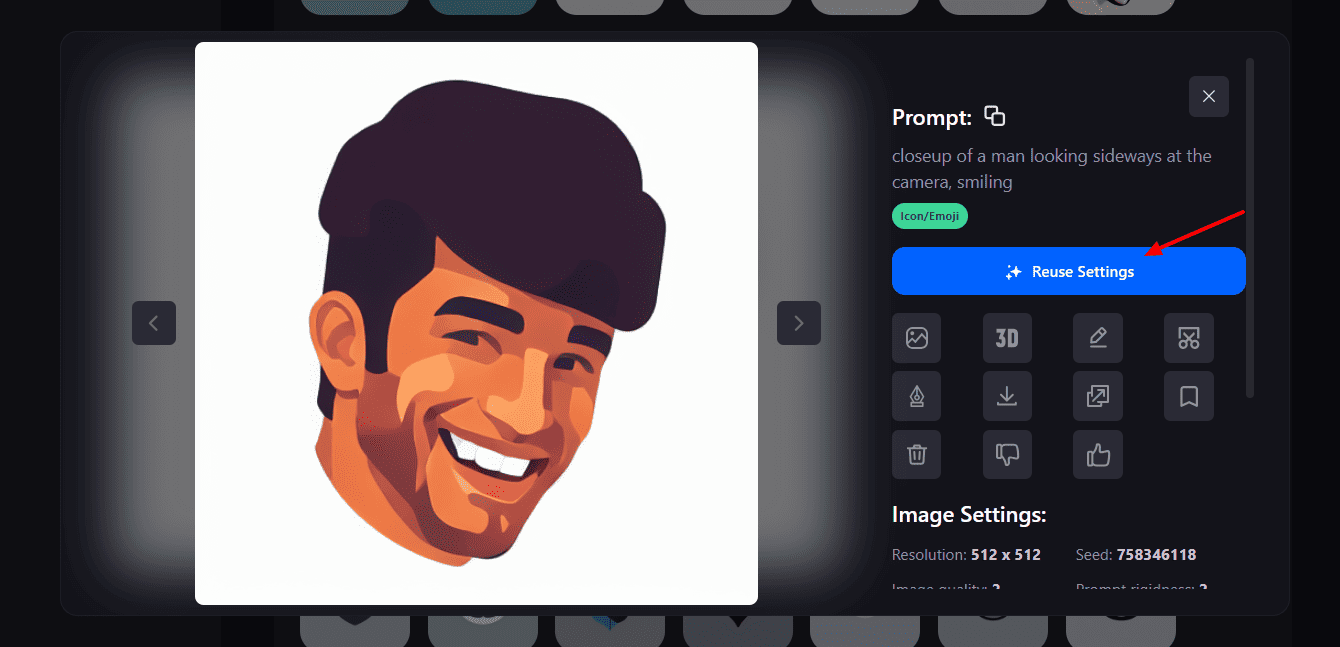 You simply need to click on the image and hit the ‘Reuse Settings’ to keep the settings intact and generate similar images.