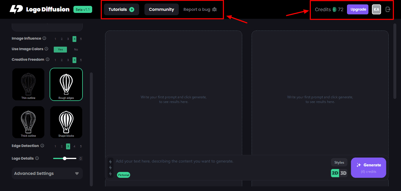 The Top section features Logo Diffusion tutorials and account settings. Whereas, the left panel comprises settings for your images. On the bottom, you get a text field to enter your prompts. The generated images are previewed on the main screen.