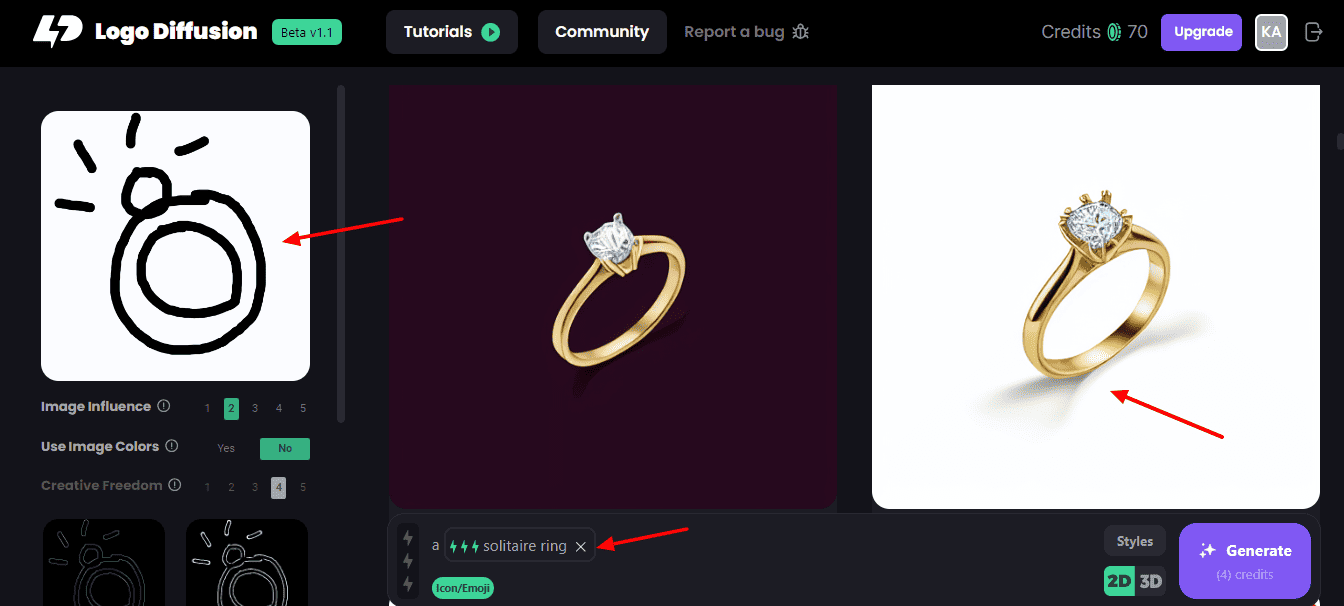 In the above image, I tried to generate a 3-dimensional logo of a solitaire ring by drawing it with the pen tool. The results are again, unbelievably good! You can experiment with tonnes of different doodles and drawings and generate awesome customized ogos!
