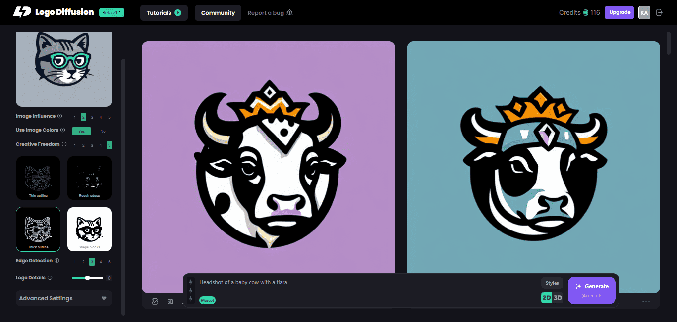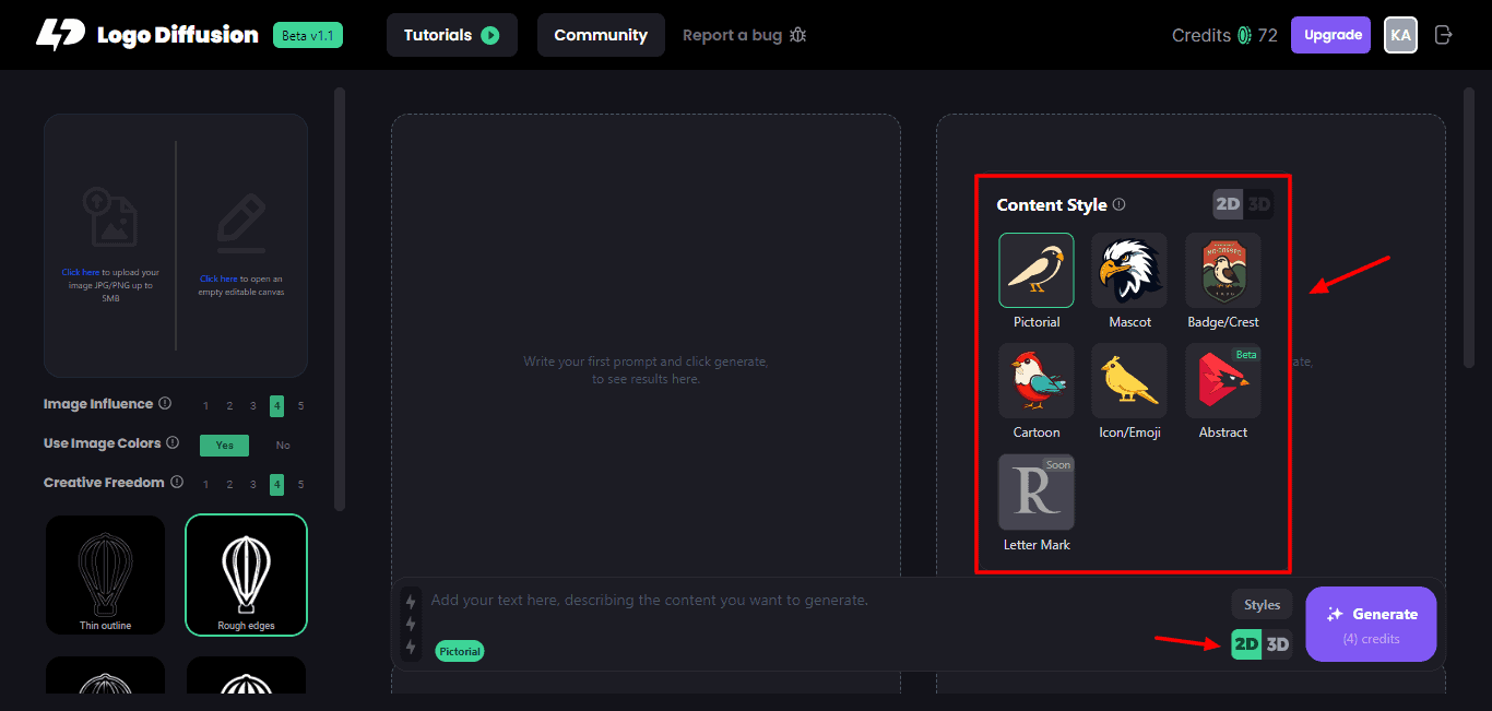 You can generate both 2-dimensional and 3-dimensional logos with Logo Diffusion. When generating 2D logos, it allows you to choose from 6 styles. These include- Pictorial, Cartoon, Icon/Emoji, Abstract, Badge/Crest, Mascot, etc.