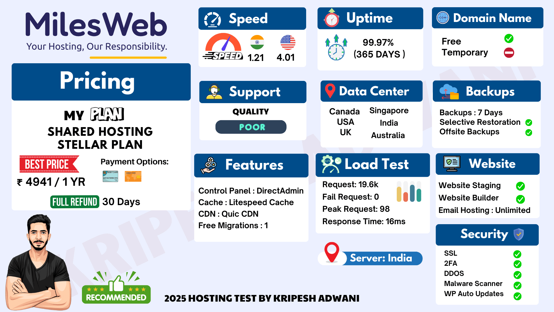 MilesWeb offers decent speeds, uptime, and Hindi call support at a budget-friendly price. However, it lacks key features like proper backups, CDN settings, and consistent support.