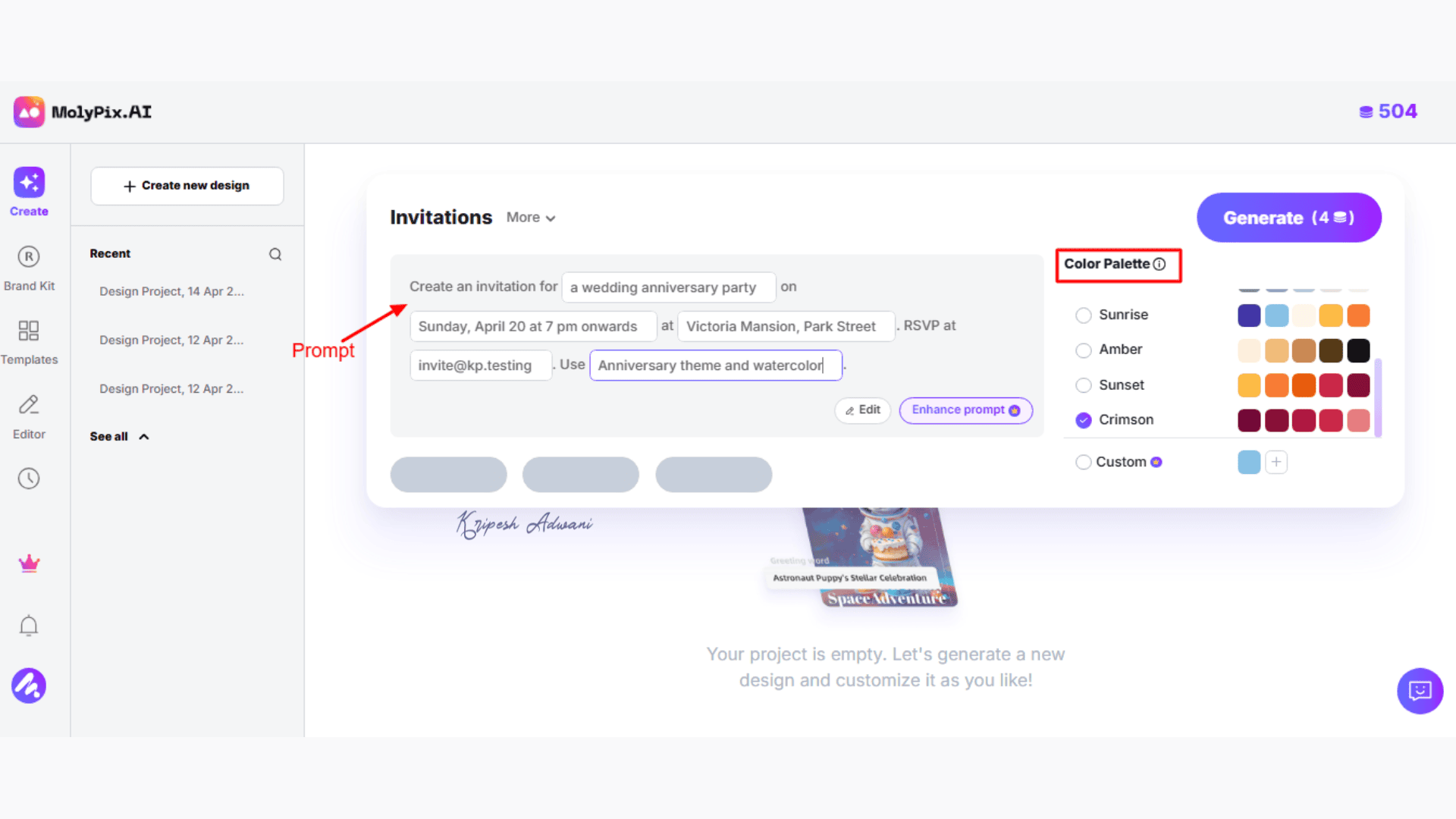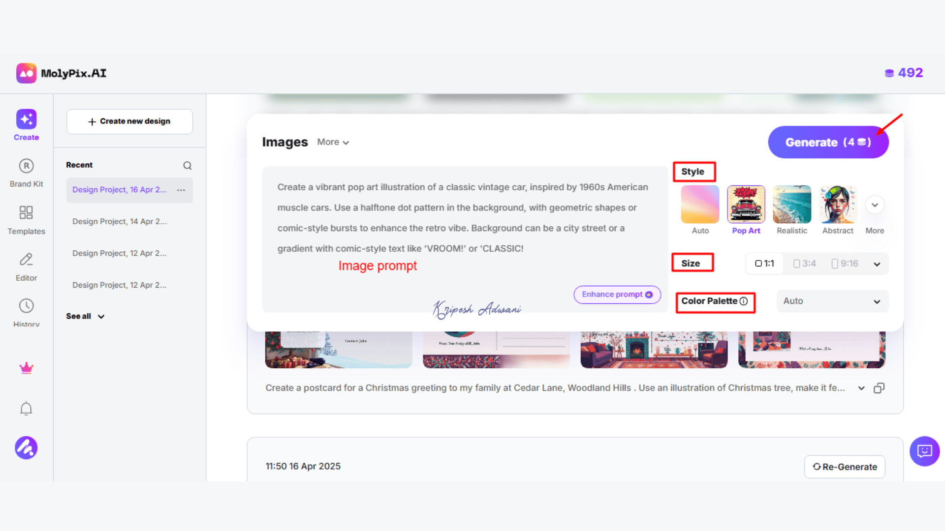 As you can see, Molypix automatically generates a detailed prompt based on your input. You can edit this prompt if needed, and then click “Generate” to create your design.