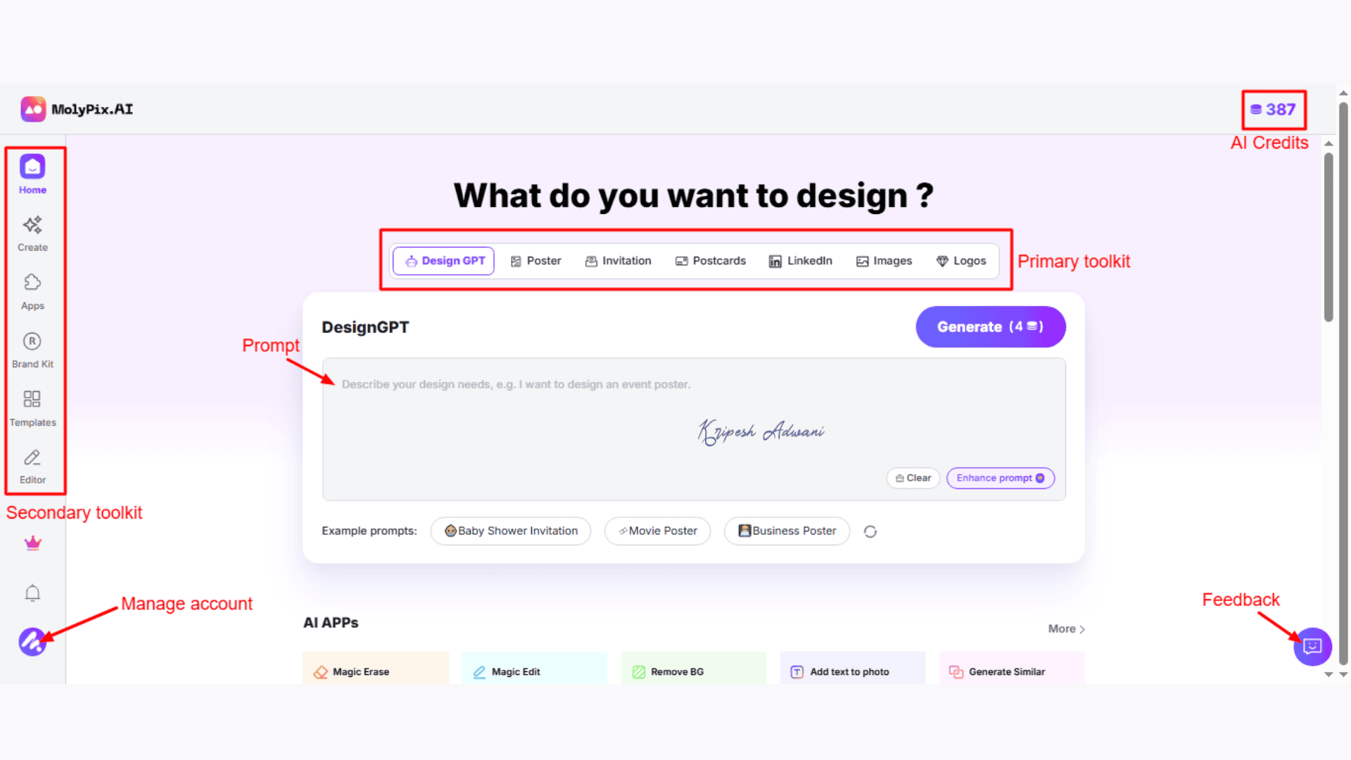 In Molypix AI, if you don’t want to use the preset design tools, DesignGPT helps you create custom designs from detailed text prompts.