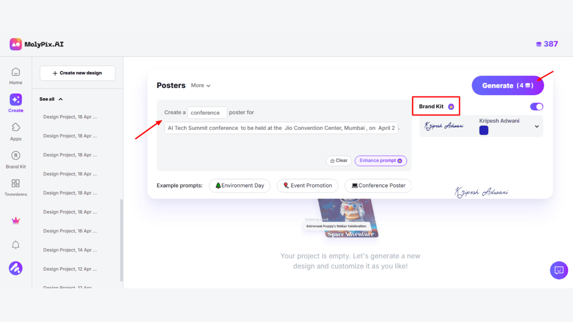 Molypix AI offers a dedicated poster creation dashboard where you can enter the poster type, brand name, and other relevant details. You also have the option to add your brand kit, including your logo, brand name, and color palette.