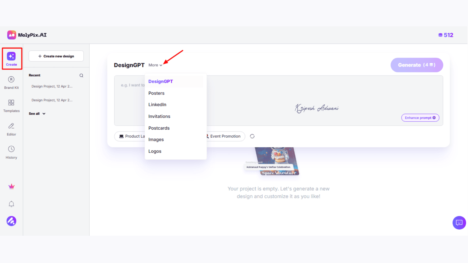 Molypix AI has a clean design and intuitive layout. On the homepage, you’ll find the design space where you can enter your prompt. All the primary tools—like DesignGPT, Poster Maker, and Image Generators—are organized under a dropdown menu for easy access.