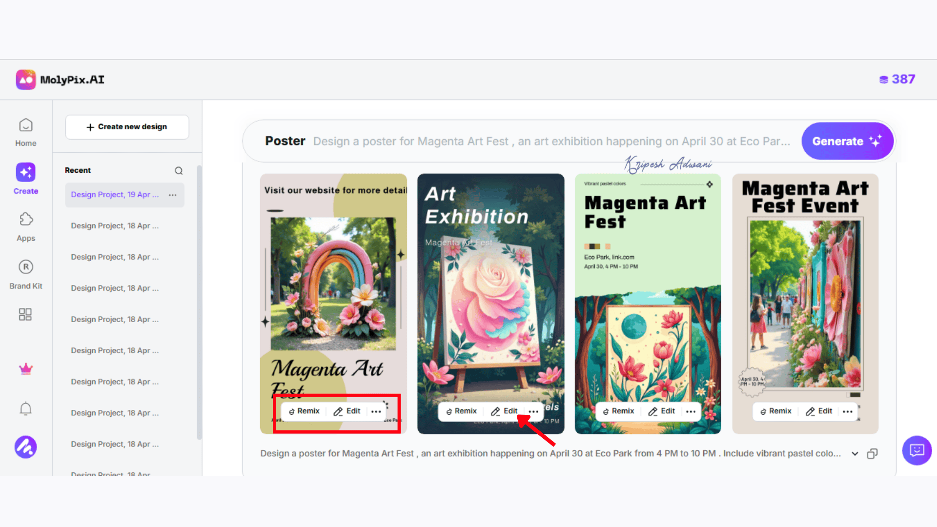 Molypix AI generates four designs by default. Choose the one you like best and click “Edit.” This opens a separate dashboard with a full range of editing tools—from basic adjustments to advanced customizations.