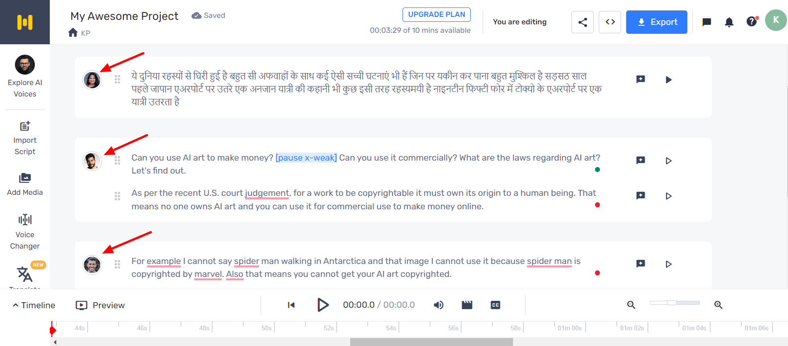 An interesting feature of Murf AI is the ability to assign multiple speakers to a script. You can get different speakers to narrate different parts of the text as per your requirements.