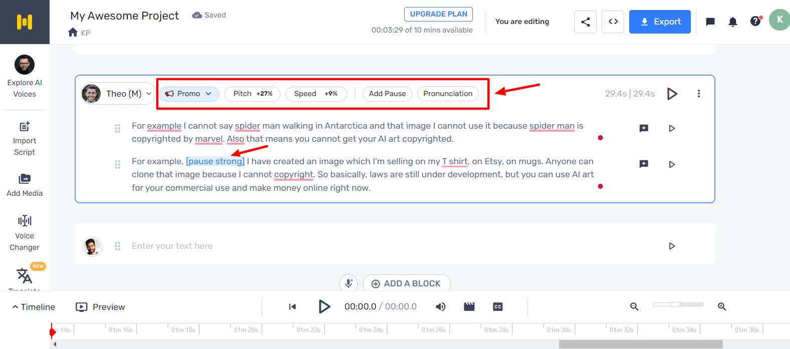 You can either type in your text or import your script as a txt, .docx, or .srt file. To customize your AI voice, you get a few limited options. You can adjust the pitch and speed of narration. You can also add pauses of any length between different words to create the right impact.