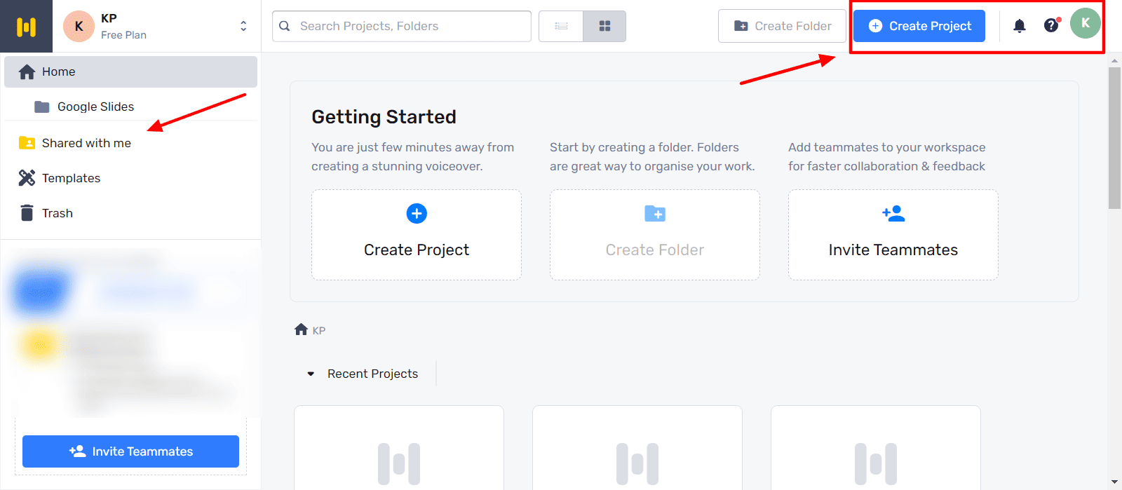 The user interface of Murf AI is simplistic and easy to use. It is well-organized and looks friendly for beginners. On the main screen, you can find options to create a new project, view your recently created projects, and invite your teammates.