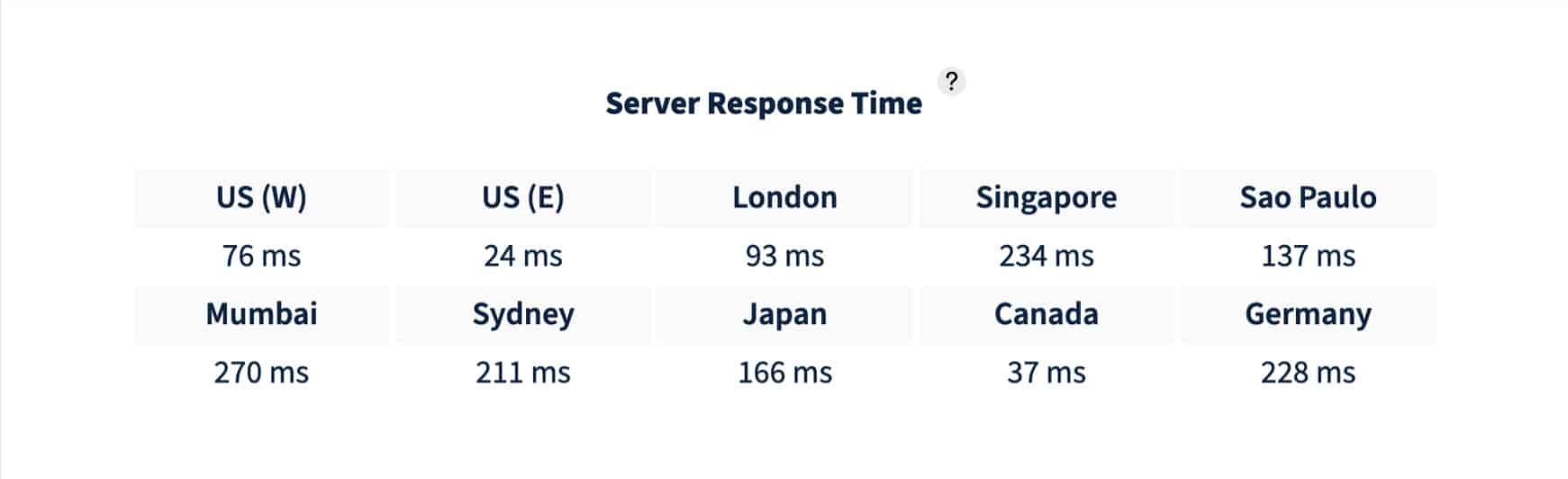 The server response time is quite low in the US regions, including 24 ms in the US (East) and 76 ms in the US (West).